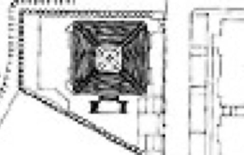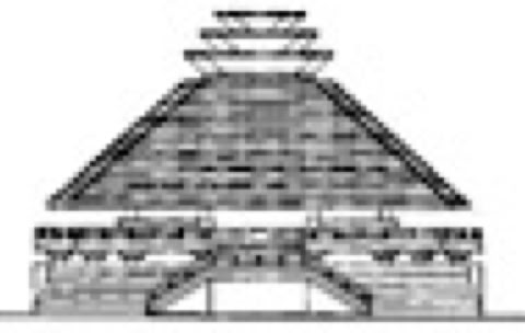 The copper sheeting, weathered over time, will develop a greenish patina, accentuating the monumentality of the pyramidal form. The heavily-rusticated base effectively counter-balances the strong roof geometry. The column supporting the roof are deeply recessed from the roof perimeter, giving the impression of the roof floating over the podium. This imagery is more effective at dusk, when the roof appears to be supported on a band of light which bursts forth, volcano-like, through the occulus at the apex.